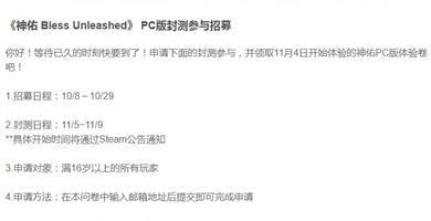 网游《神佑(Bless Unleashed)》目前已在Steam平台上线,根据官方公告,《神佑》Steam版将于11月5日开始为期5天的封闭测试,目前封测的招募已经开启。《神佑》是一款与众多玩家一起畅...