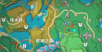 1. 需要找到两个镇物蛇神之首·磐柱镶珠和蛇神之首·磐柱镇石,这两个物件分别在地图上红圈的两个地方,通过元素视野去找先去左边那个红圈地点拿珠子。2. 进地图会发现按下图有7个发光机...