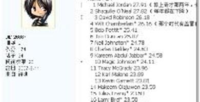 在网上搜到一份NBA效率值的前百位排名,不错的资料,马上把它下到自己电脑上存起来。(如下图所示)但说我对这份名单的排名不感兴趣,只要进了百强,从排前三的乔丹奥尼尔罗宾逊到最后的琼斯在我看来都是一样棒的...