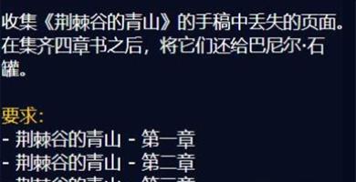 魔兽世界游戏中,荆棘谷的青山是荆棘谷区域非常经典的任务,一共有四章,每一章需要的页都不同。1、荆棘谷的青山 - 第一章,需要第1、4、6、8页。2、荆棘谷的青山 - 第一章,需要第10、11、14、1...