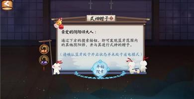 阴阳师们进入召唤小屋后,点击右侧赠予按钮进入式神赠予系统,打开蓝牙搜索与定位功能后,与想要赠送的好友一同点击屏幕中的开始搜索按钮寻找对方。 双方确认后,即可进入式神赠予系统,点击想要赠送给好友的式神。...